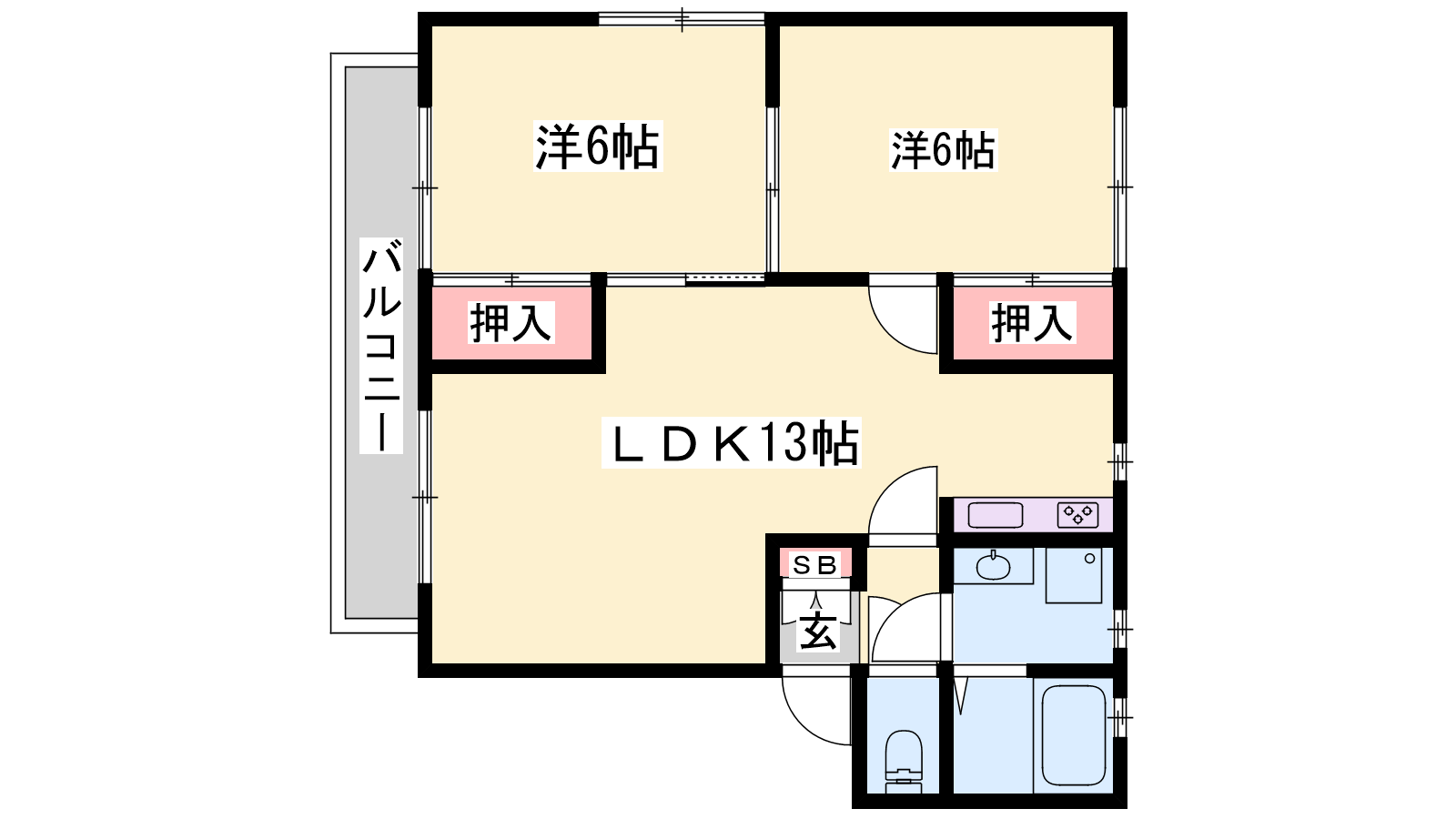 - LDK13帖、洋室6帖、洋室6帖