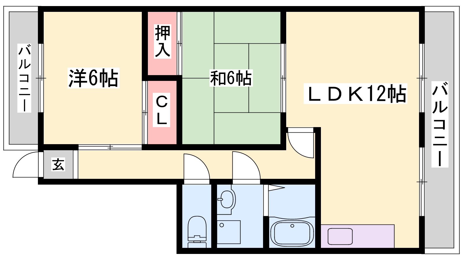 - LDK12帖、洋室6帖、洋室6帖