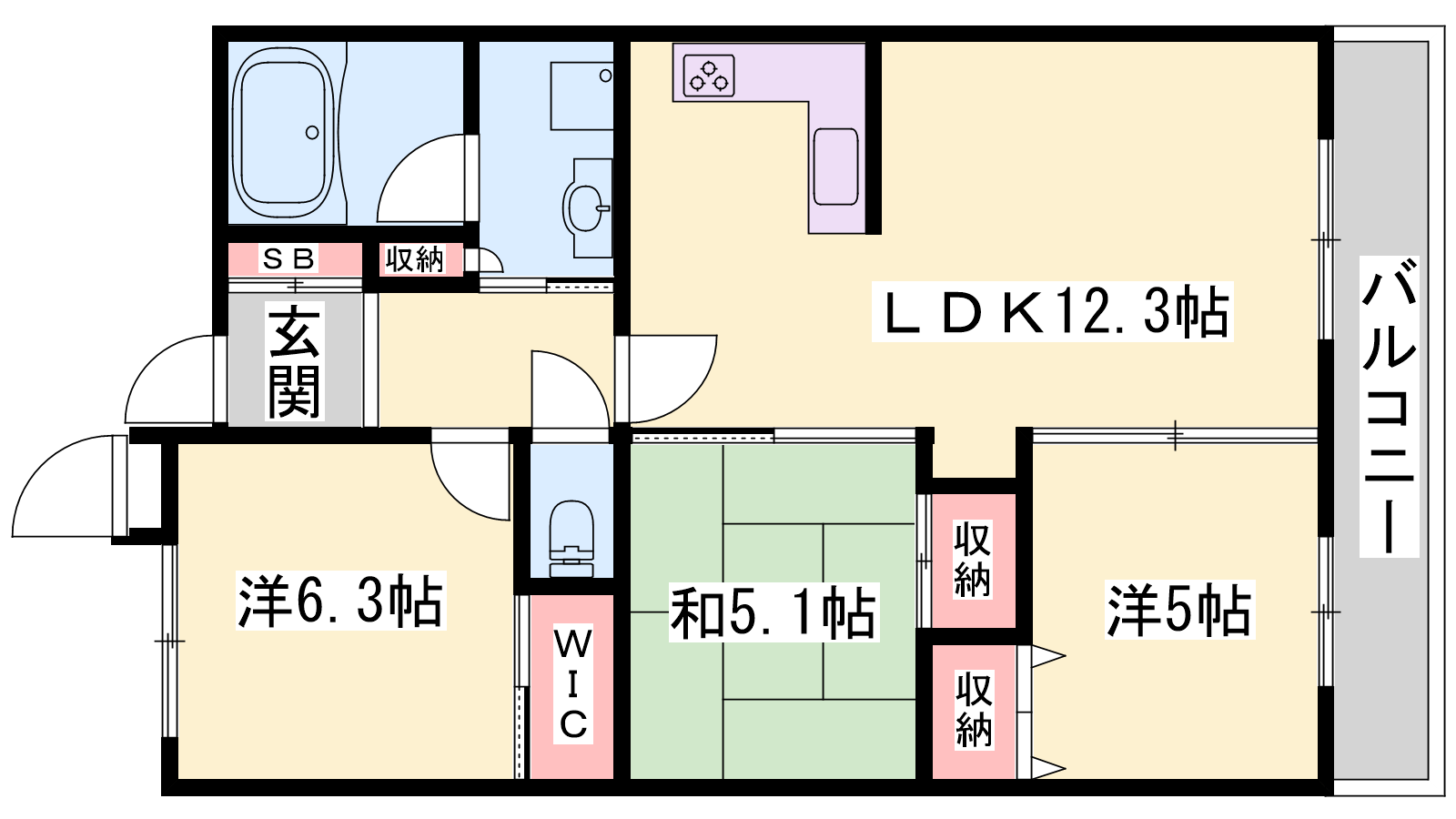 - LDK13.1帖、洋室6.3帖、洋室5帖、和室6帖