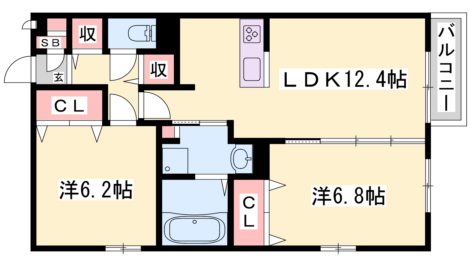 - LDK12.4帖、洋室6.2帖、洋室6.8帖