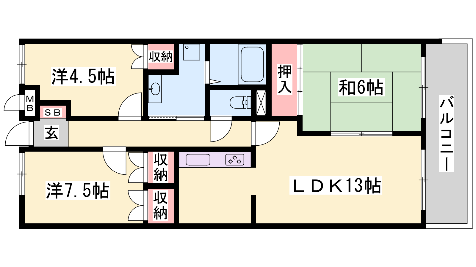- LDK13帖、洋室7.5帖、洋室4.5帖、和室6帖