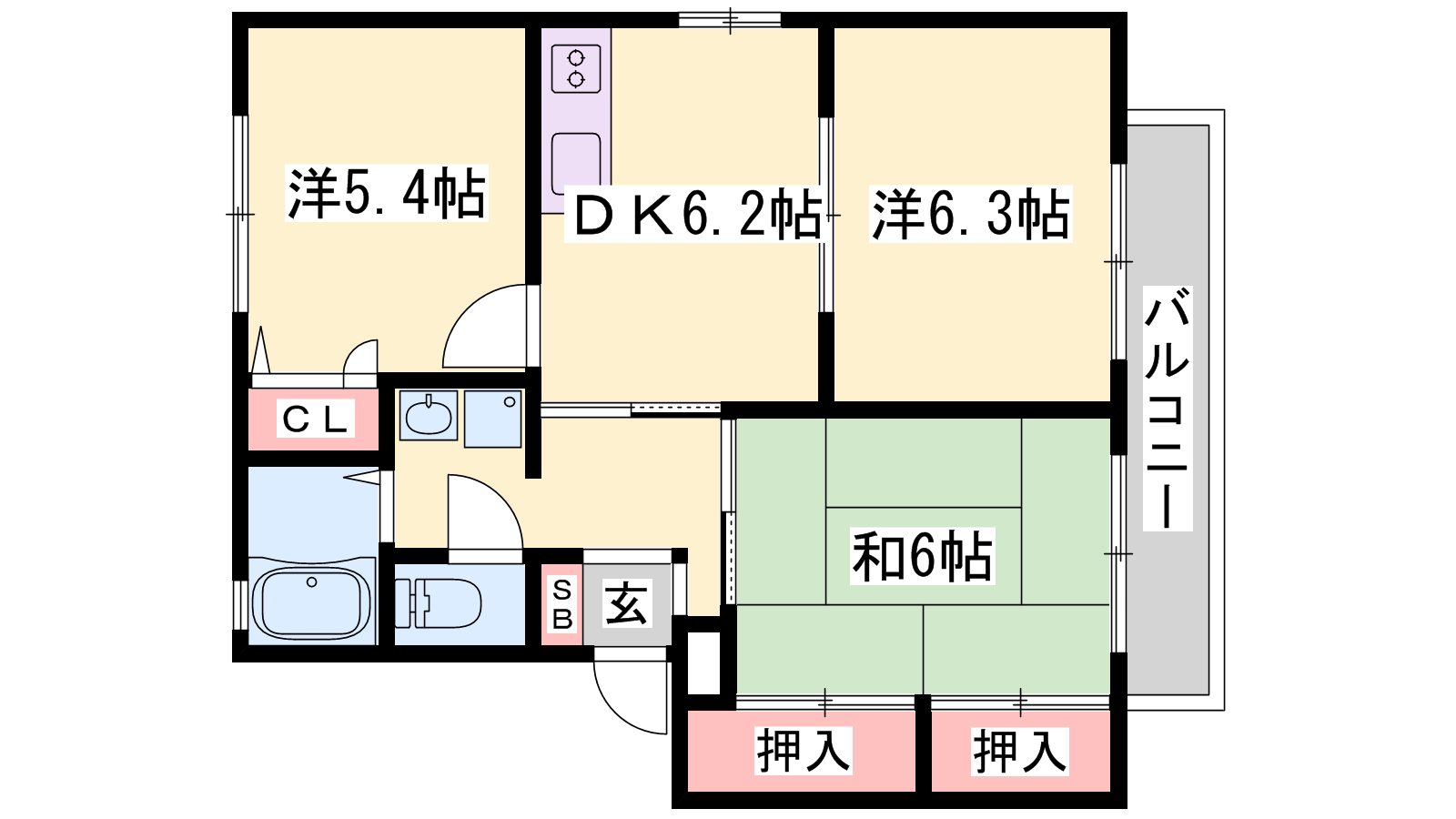 - DK6.2帖、洋室6.3帖、洋室5.4帖、和室6帖