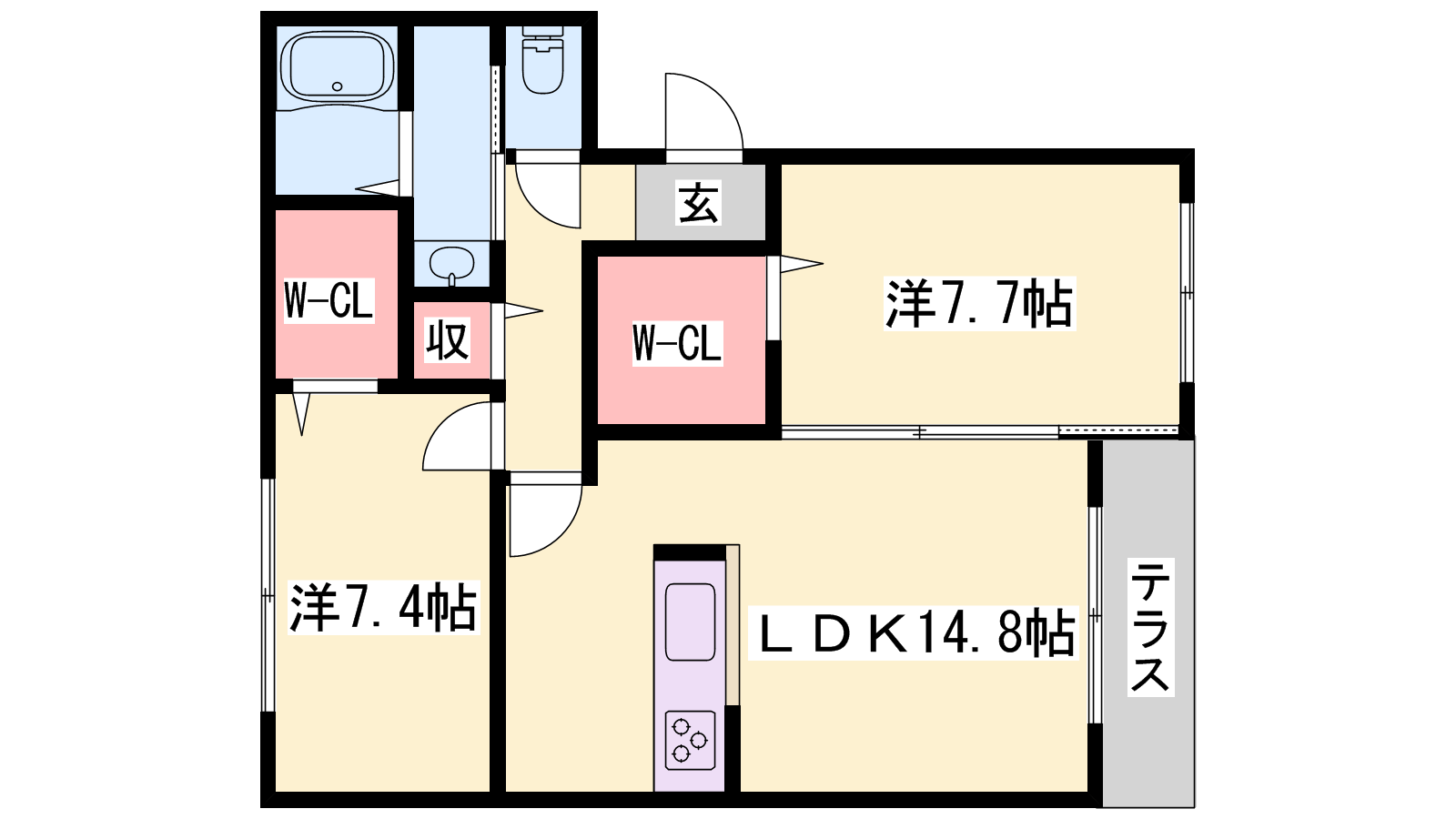 - LDK14.8帖、洋室7.7帖、洋室7.4帖