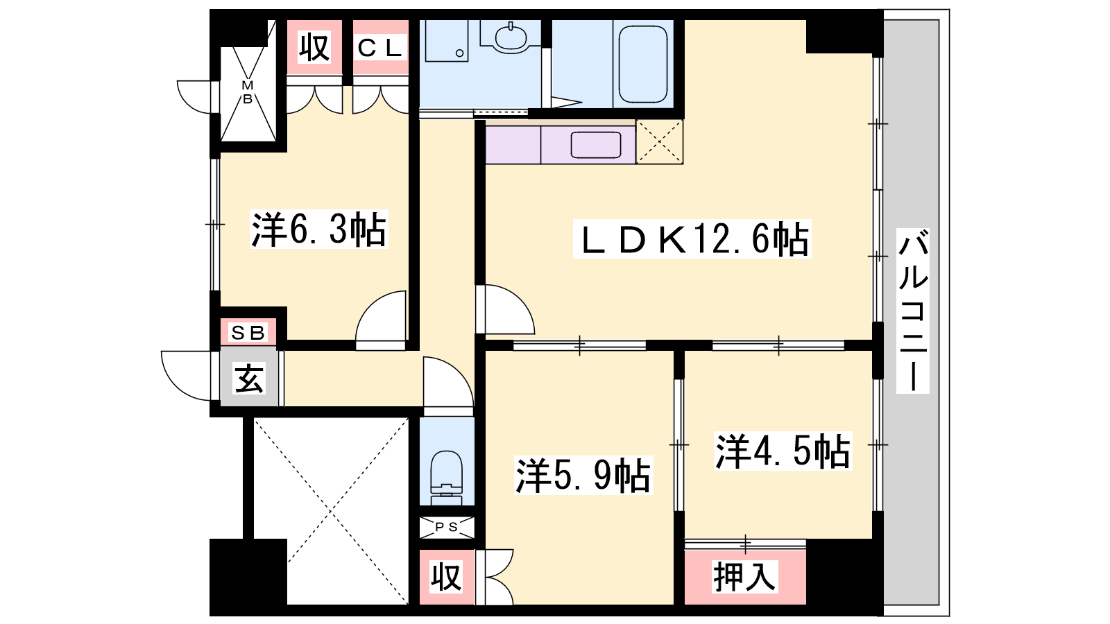 - LDK12.6帖、洋室5.9帖、洋室6.3帖、洋室4.5帖