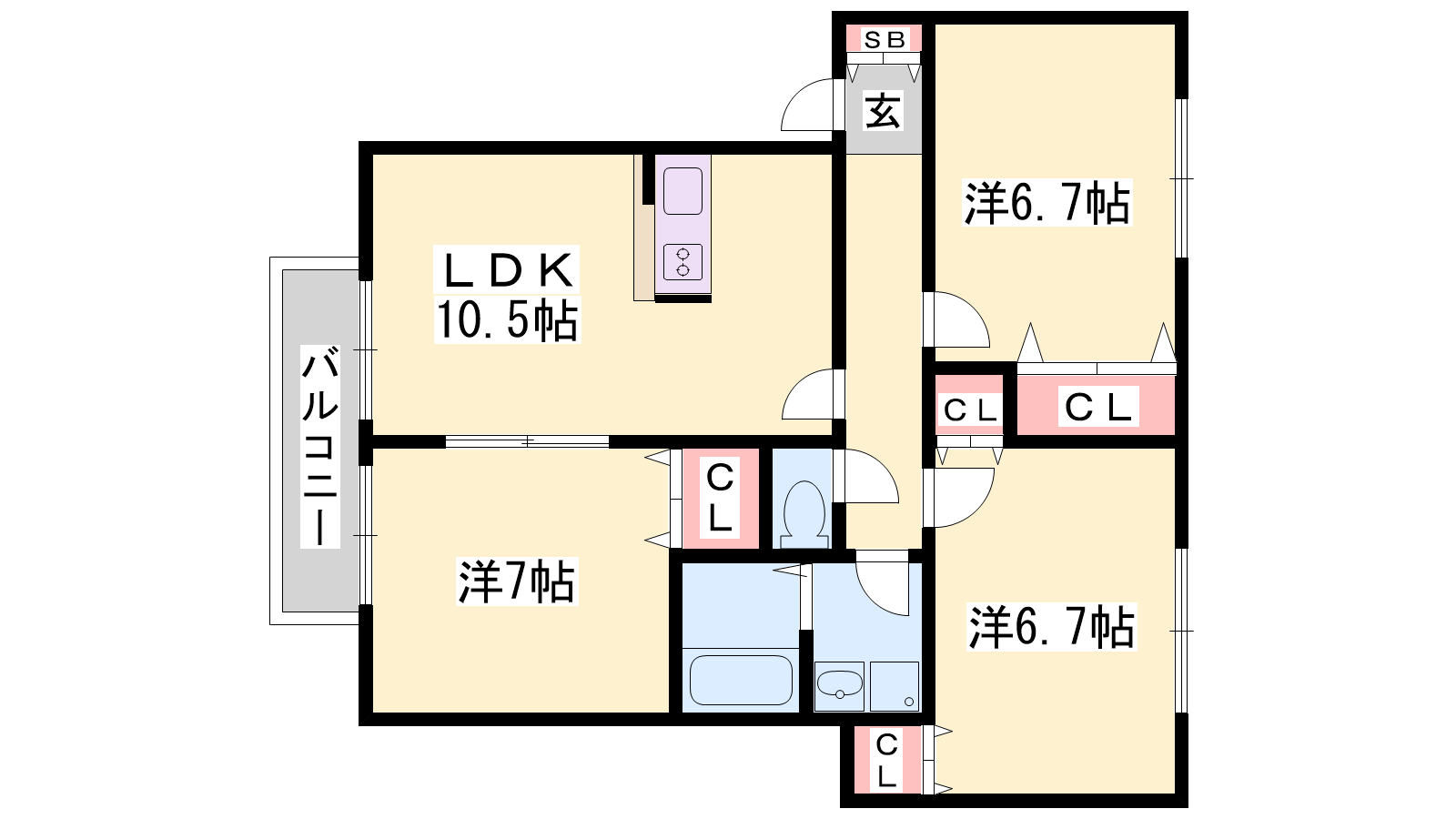 - LDK10.5帖、洋室7帖、洋室6.7帖、洋室6.7帖
