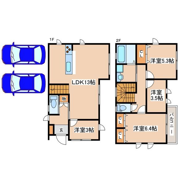 - LDK13帖、洋室6.4帖、洋室5.3帖、洋室3.5帖、洋室3帖