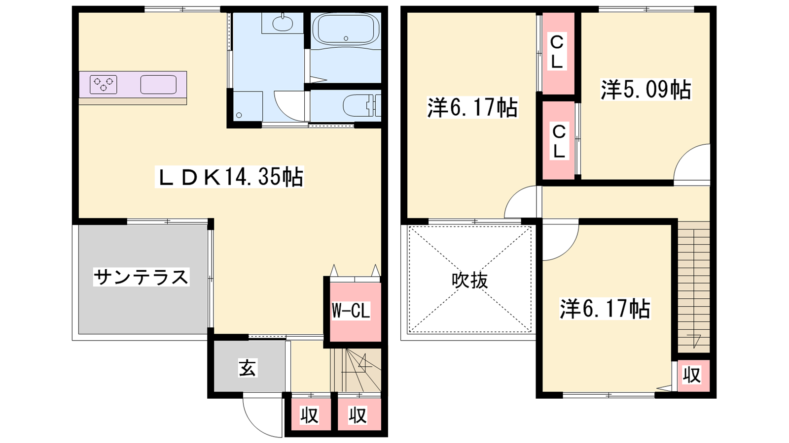 - LDK14.35帖、洋室6.17帖、洋室6.17帖、洋室5.09帖