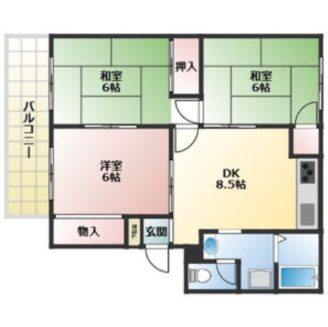 - LDK8.5帖、洋室6帖、洋室6帖、和室6帖