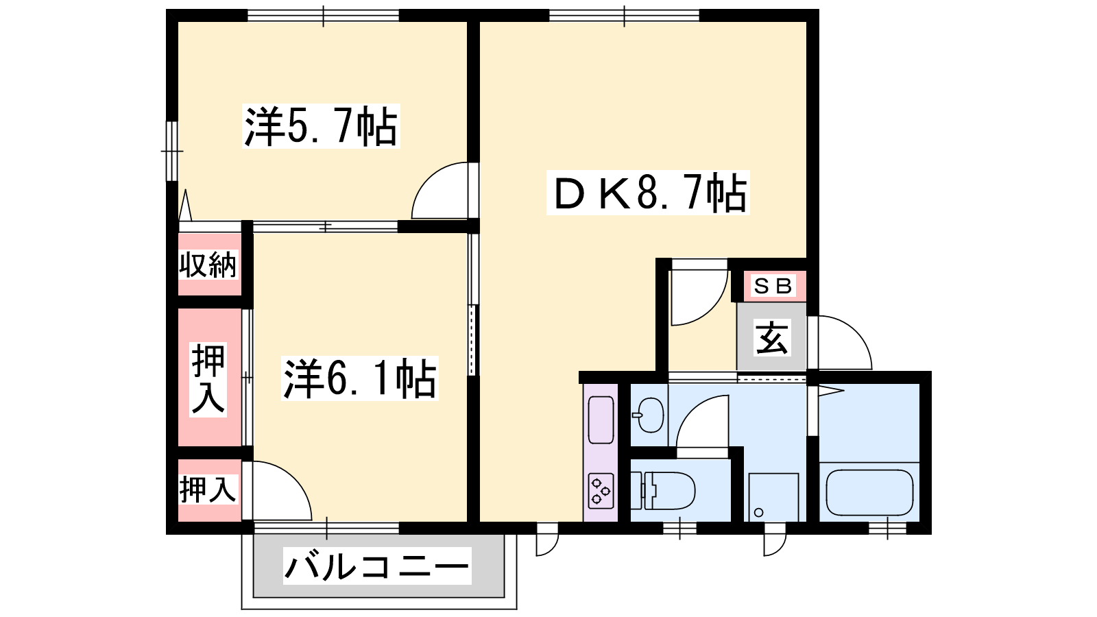 - LDK8.7帖、洋室5.8帖、洋室6.1帖