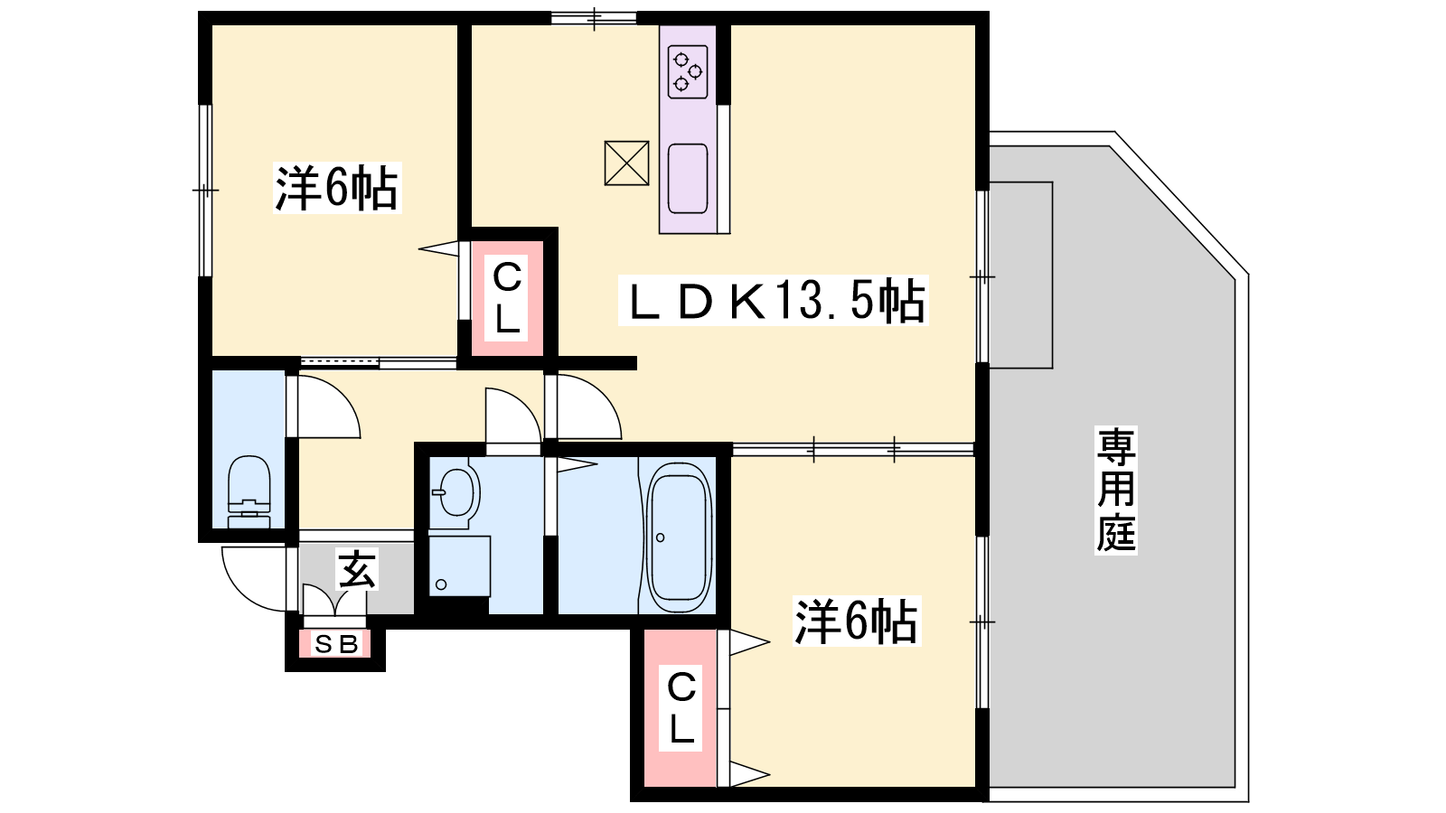 - LDK13.5帖、洋室6帖、洋室6帖