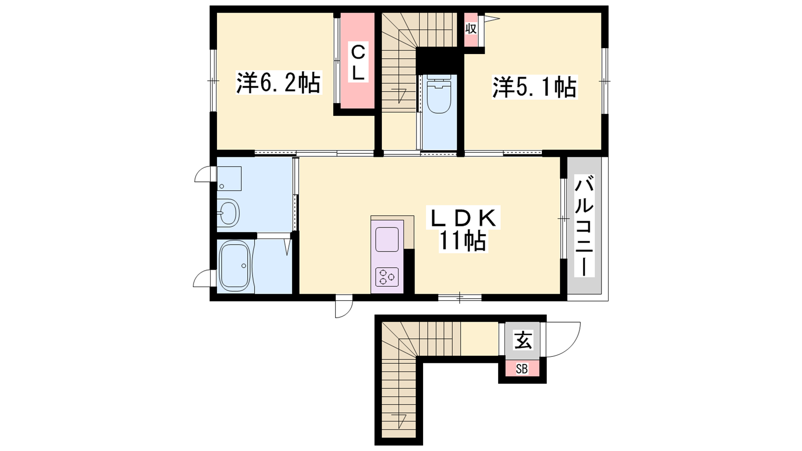 - LDK11帖、洋室6.2帖、洋室5.1帖
