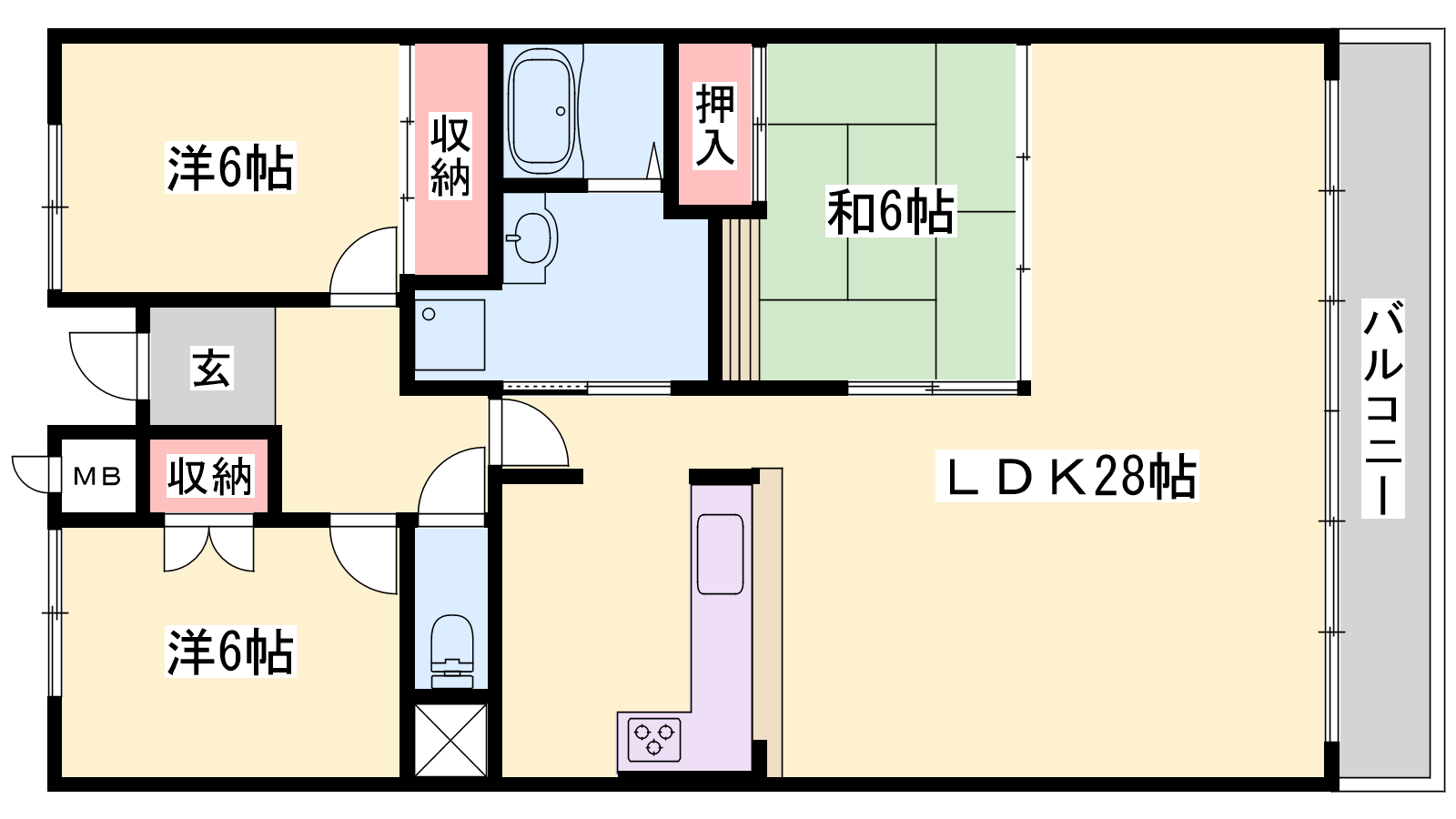 - LDK28帖、洋室6帖、洋室6帖、和室6帖