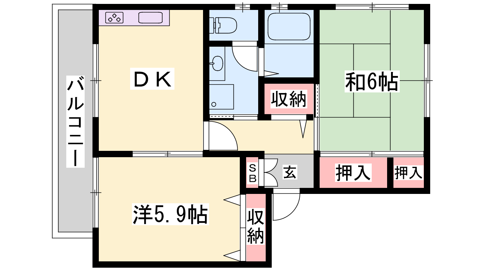 - 洋室5.9帖、和室6帖
