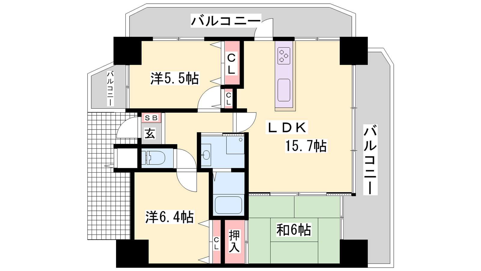 - LDK15.7帖、和室6帖、洋室5.5帖、洋室6.4帖