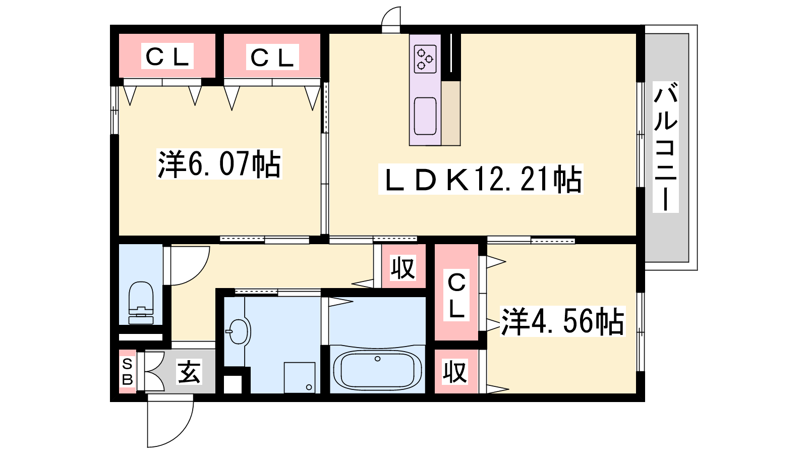 - LDK12.21帖、洋室6.07帖、洋室4.56帖