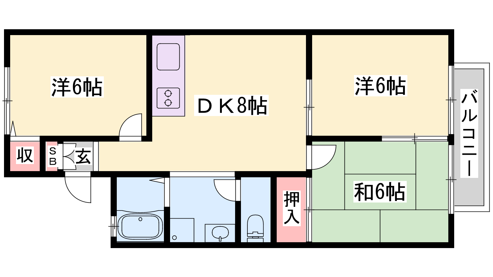 - DK8帖、洋室6帖、洋室6帖、和室6帖