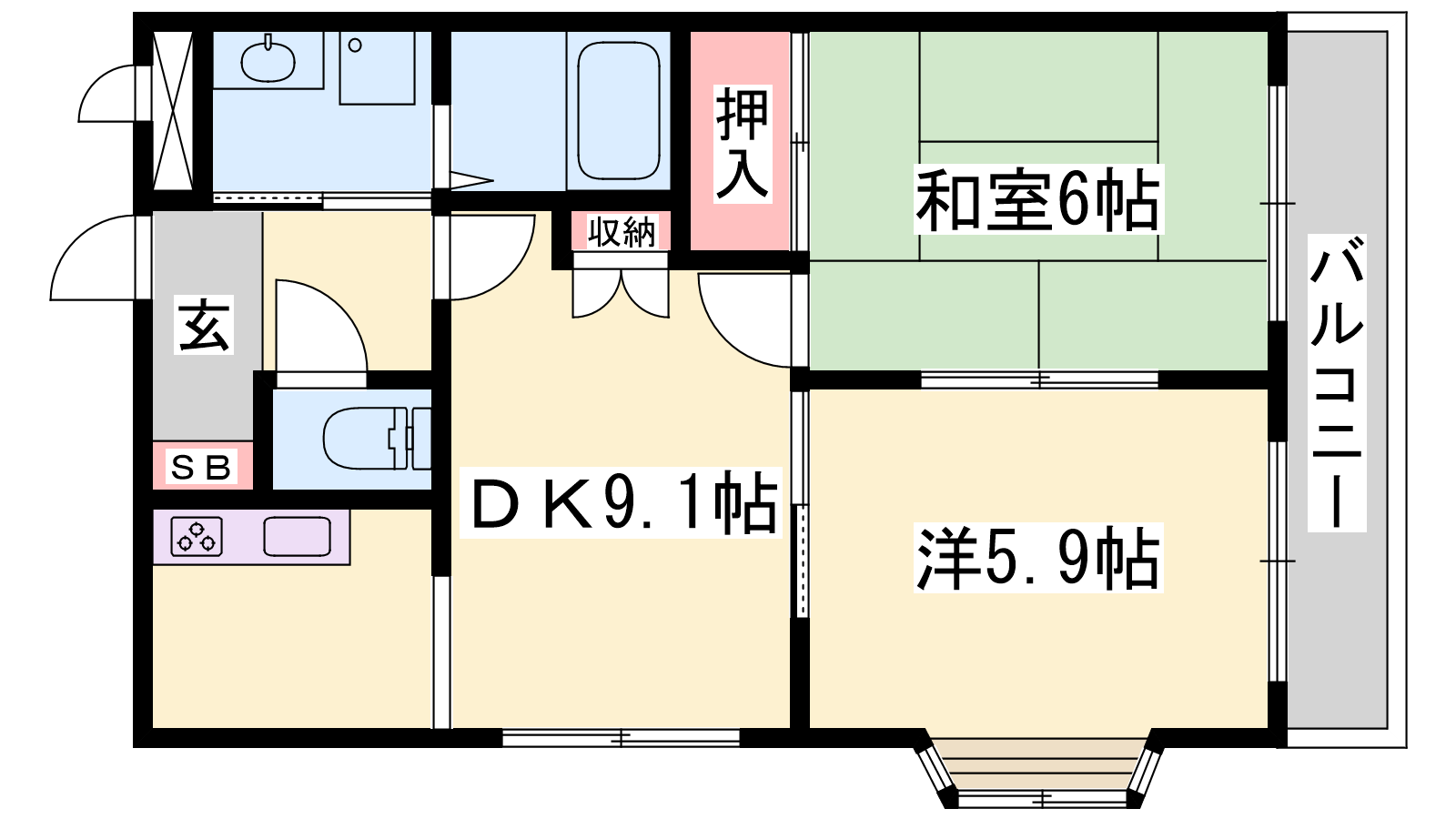 - DK9.1帖、洋室5.9帖、和室6帖