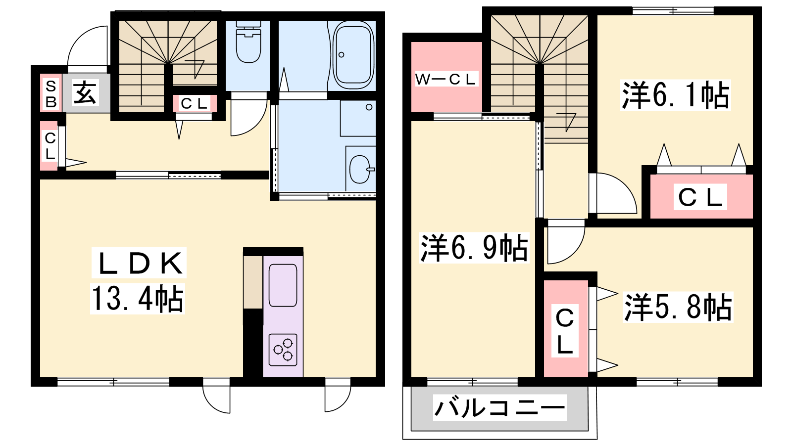 - LDK13.4帖、洋室6.9帖、洋室6.1帖、洋室5.8帖