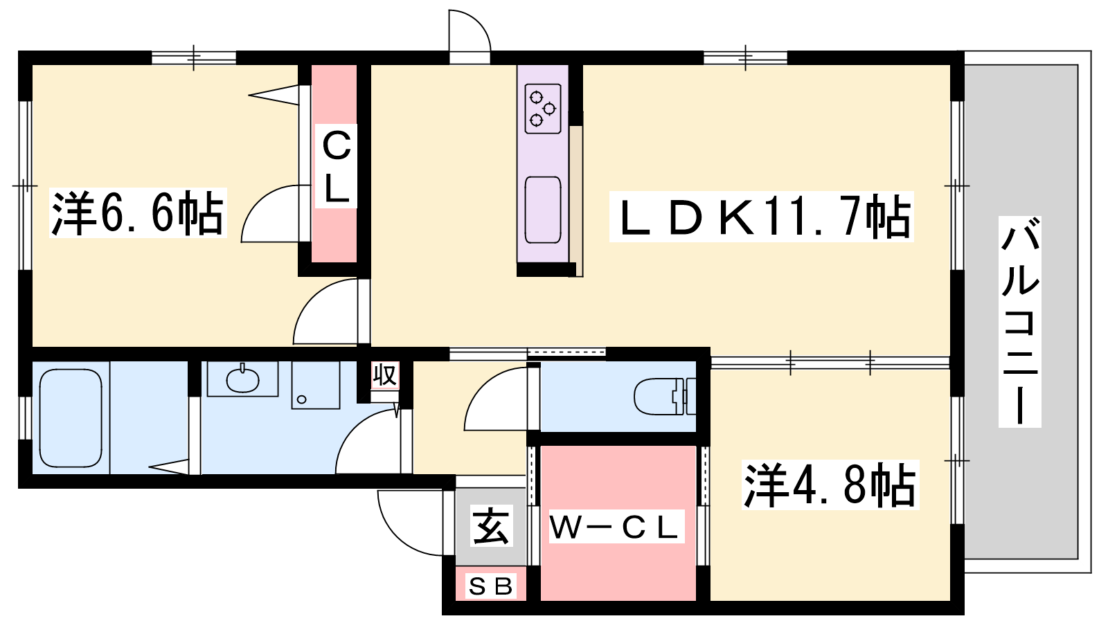 - LDK11.7帖、洋室6.6帖、洋室4.8帖