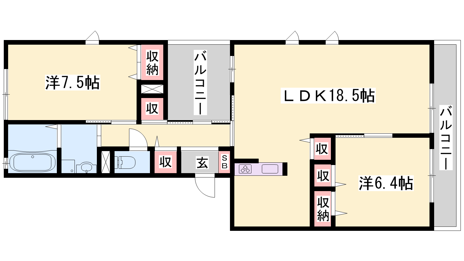 - LDK18.5帖、洋室7.4帖、洋室6.4帖