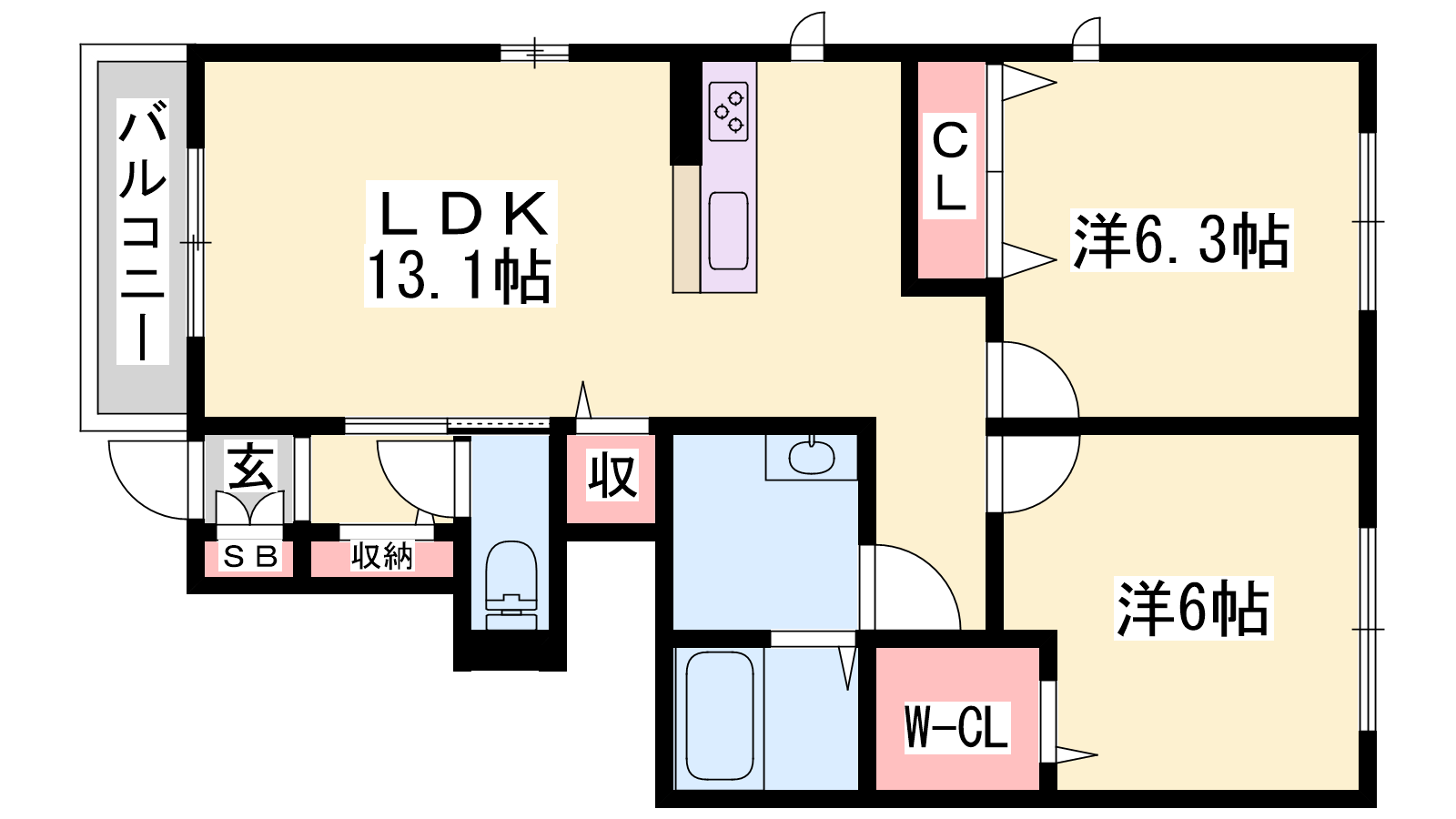 - LDK13.1帖、洋室6.3帖、洋室6帖