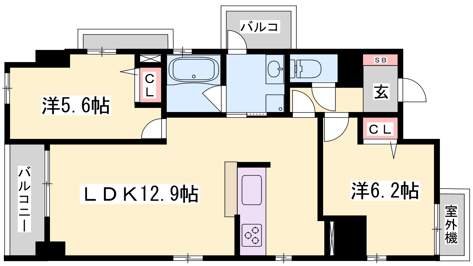 - LDK12.9帖、洋室6.2帖、洋室5.6帖
