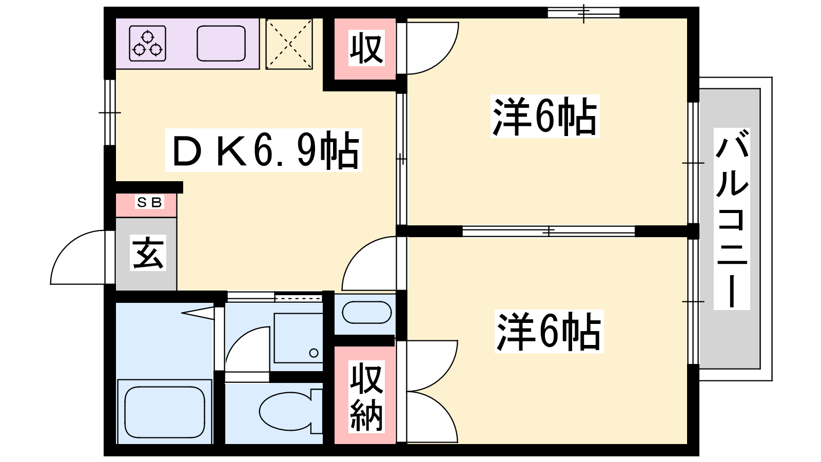 - DK6.9帖、洋室6帖、和室6帖
