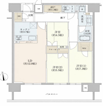 - LDK12.8帖、洋室5.5帖、洋室7.3帖、洋室4.5帖