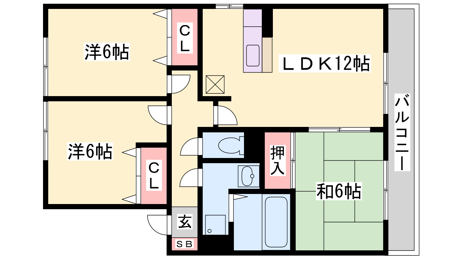 - LDK12帖、洋室6帖、洋室6帖、和室6帖