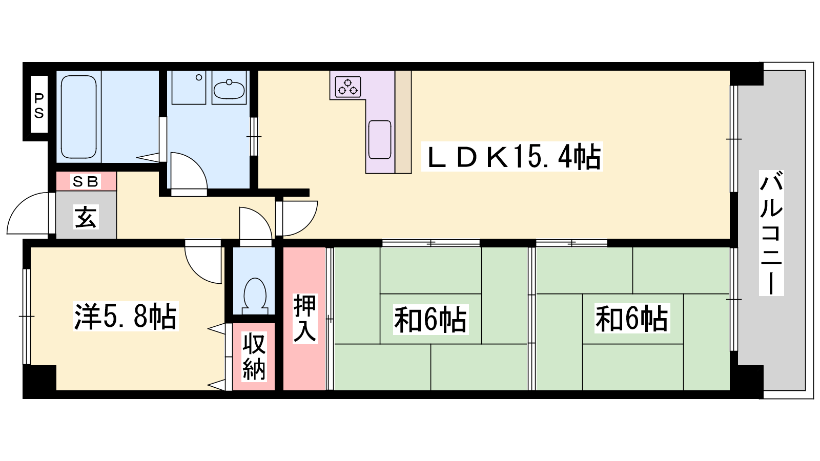 - LDK15.4帖、洋室5.8帖、和室6帖、和室6帖