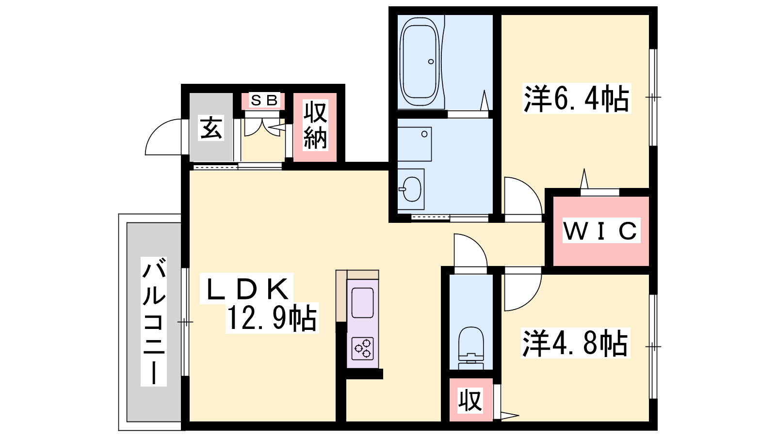 - LDK12.9帖、洋室6.4帖、洋室4.8帖
