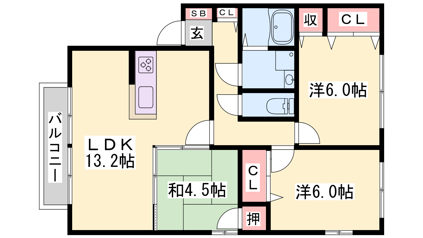 - LDK13.2帖、洋室6帖、洋室6帖、和室4.5帖