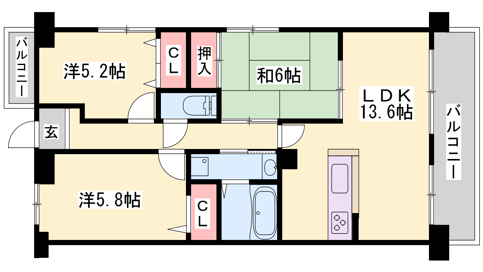 - LDK13.6帖、和室6帖、洋室5.8帖、洋室5.2帖