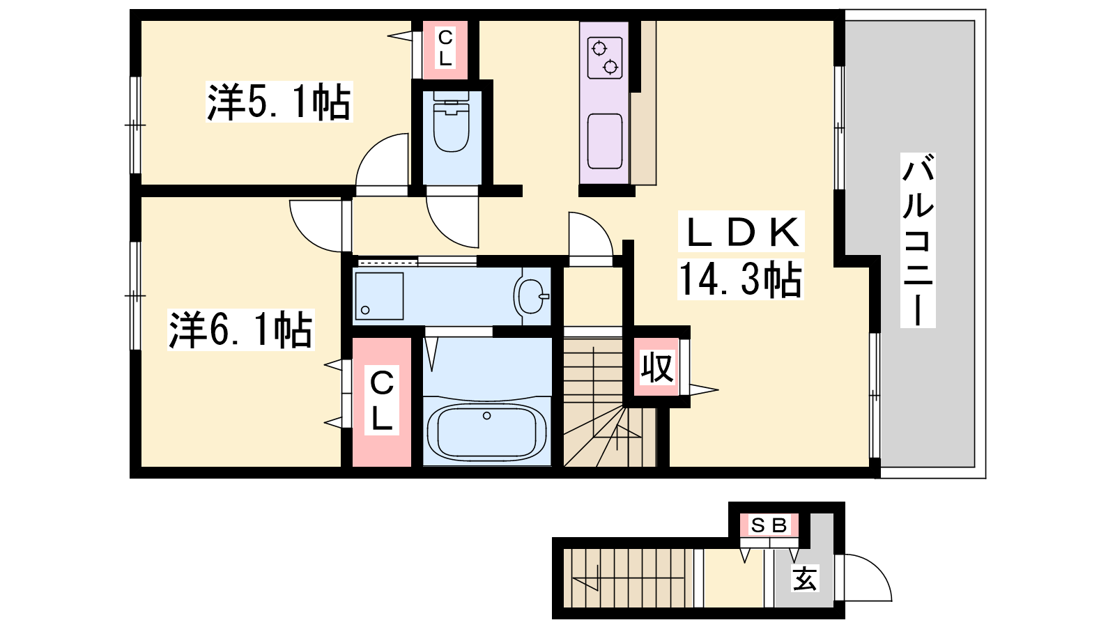 - LDK14.3帖、洋室6.1帖、洋室5.1帖