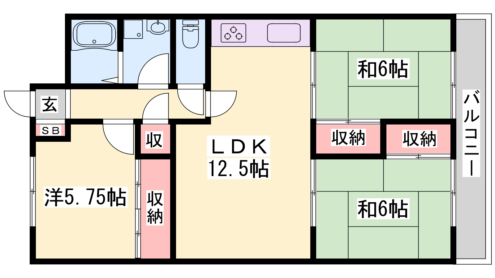 - LDK12.5帖、和室6帖、和室6帖、洋室5.75帖