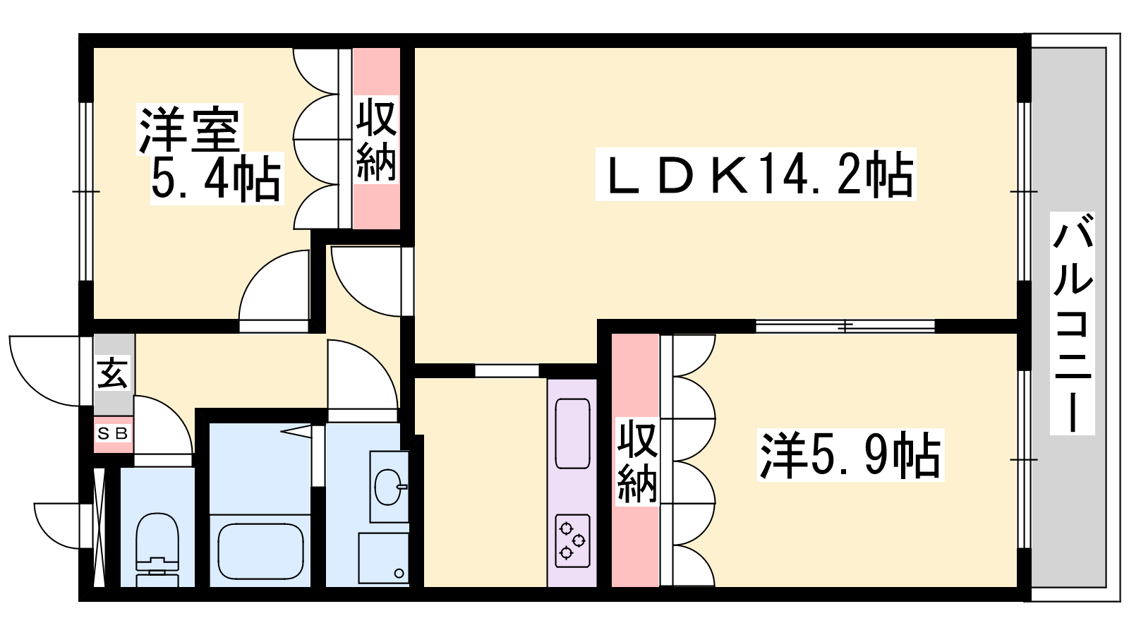 - LDK14.2帖、洋室5.9帖、洋室5.4帖