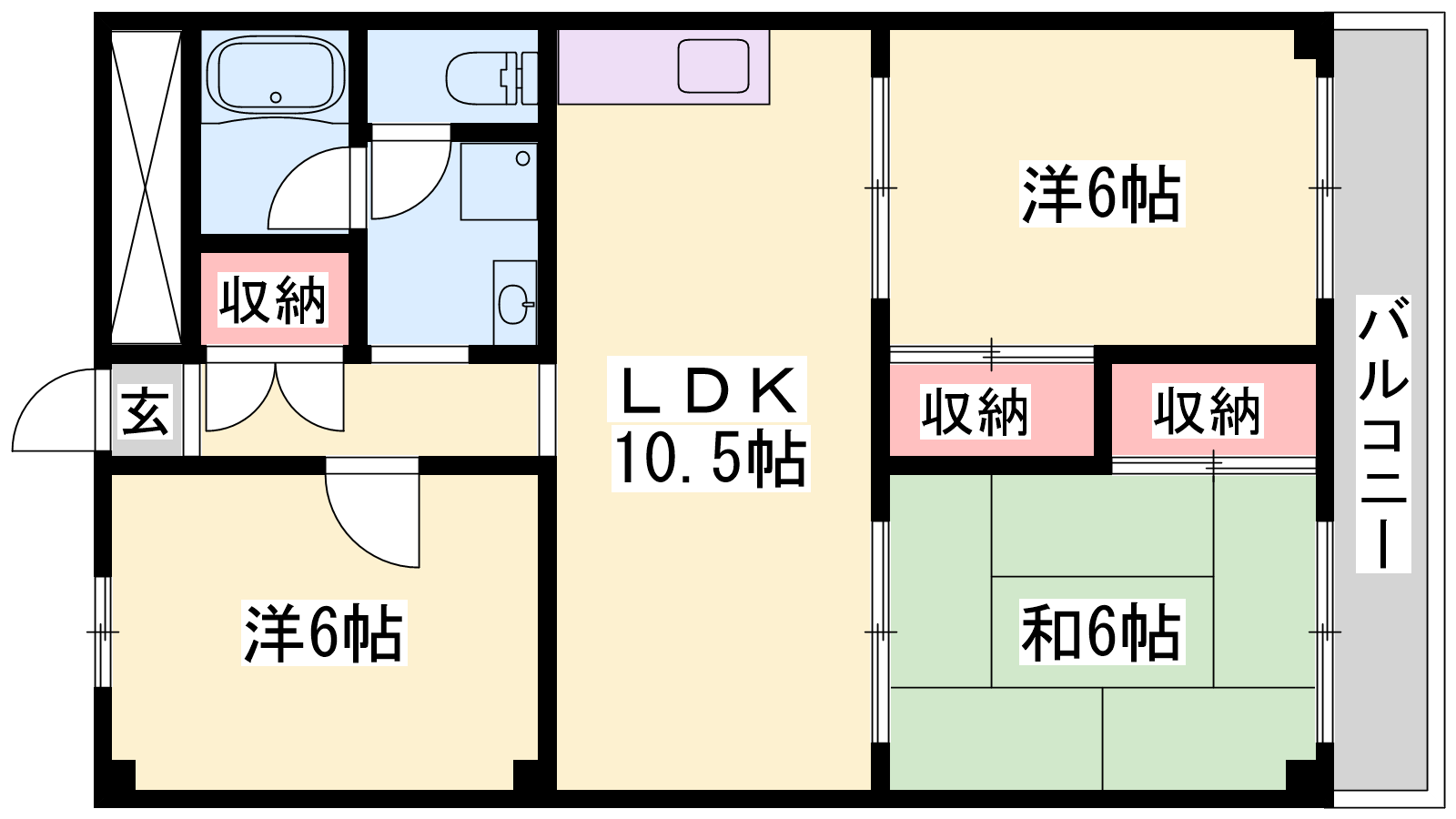 - LDK10.5帖、洋室6帖、洋室6帖、和室6帖