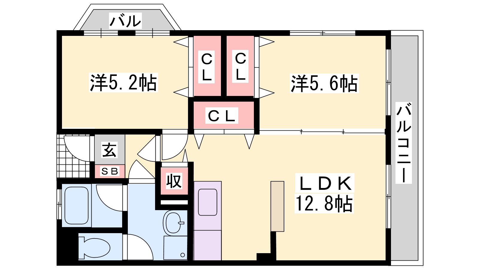 - LDK12.8帖、洋室5.6帖、洋室5.2帖