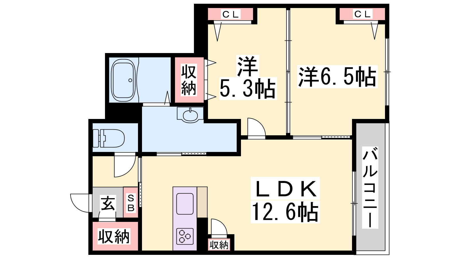 - LDK12.6帖、洋室6.5帖、洋室5.3帖