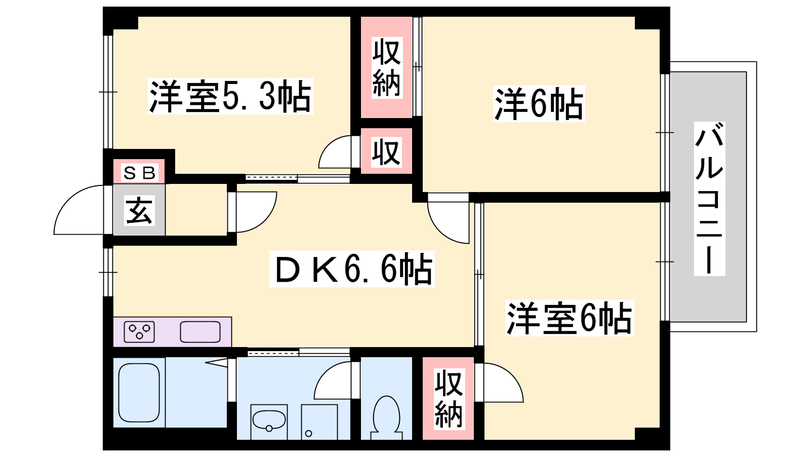 - DK6.6帖、洋室6帖、洋室6帖、洋室5.3帖