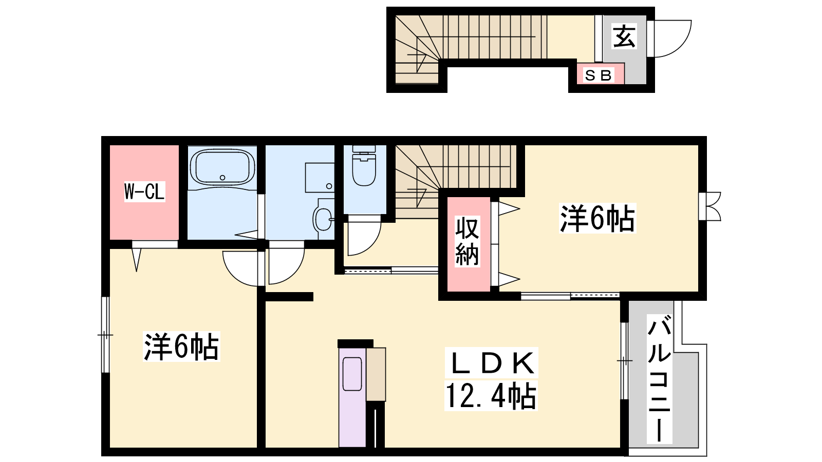 - LDK12.4帖、洋室6帖、洋室6帖