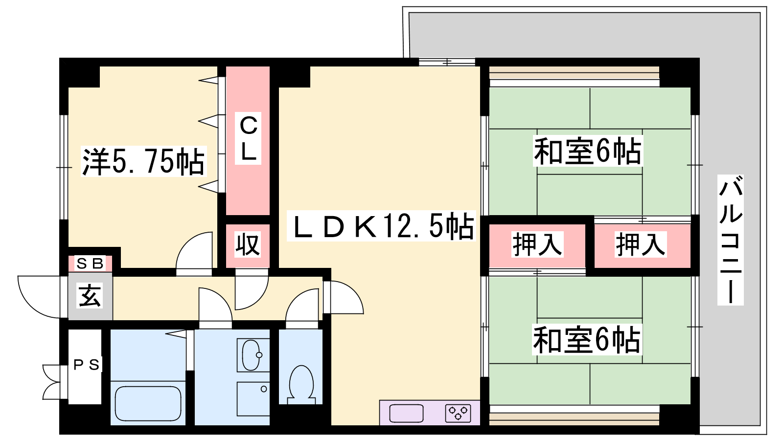 - LDK12.5帖、洋室5.75帖、和室6帖、和室6帖