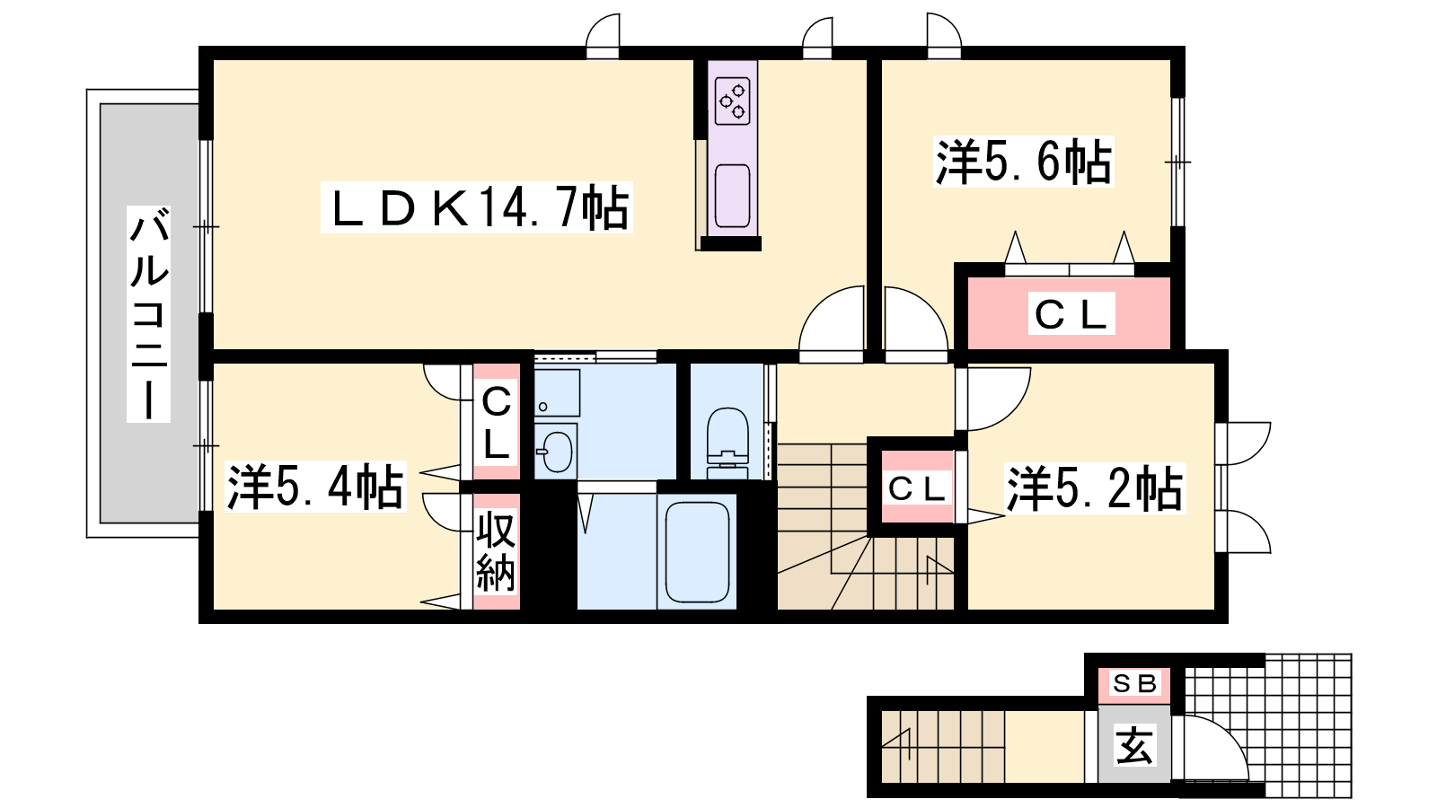 - LDK14.7帖、洋室5.6帖、洋室5.4帖、洋室5.2帖