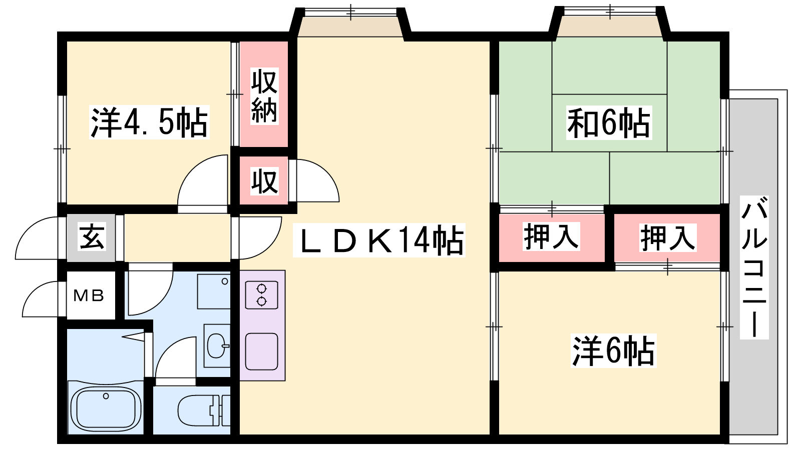 - LDK12帖、洋室6帖、洋室4.5帖、和室6帖
