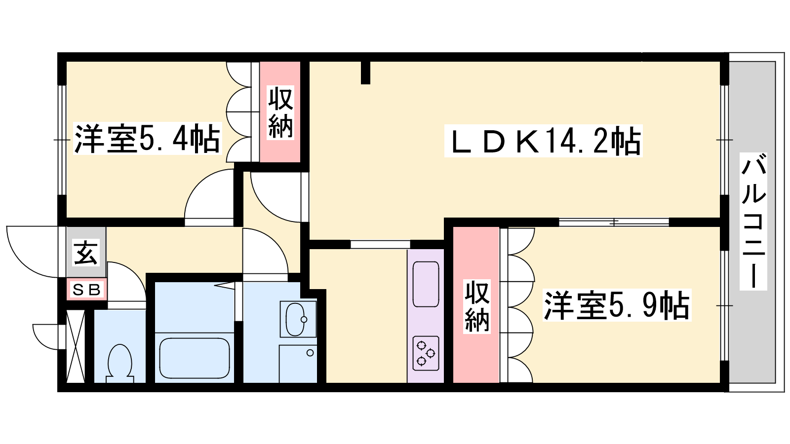 - LDK14.2帖、洋室5.9帖、洋室5.4帖