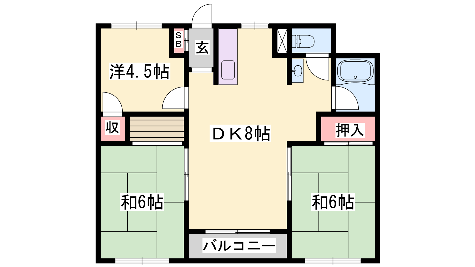 - DK8帖、洋室4.5帖、和室6帖、和室6帖