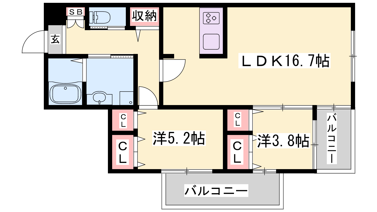 - LDK16.7帖、洋室5.2帖、洋室3.8帖