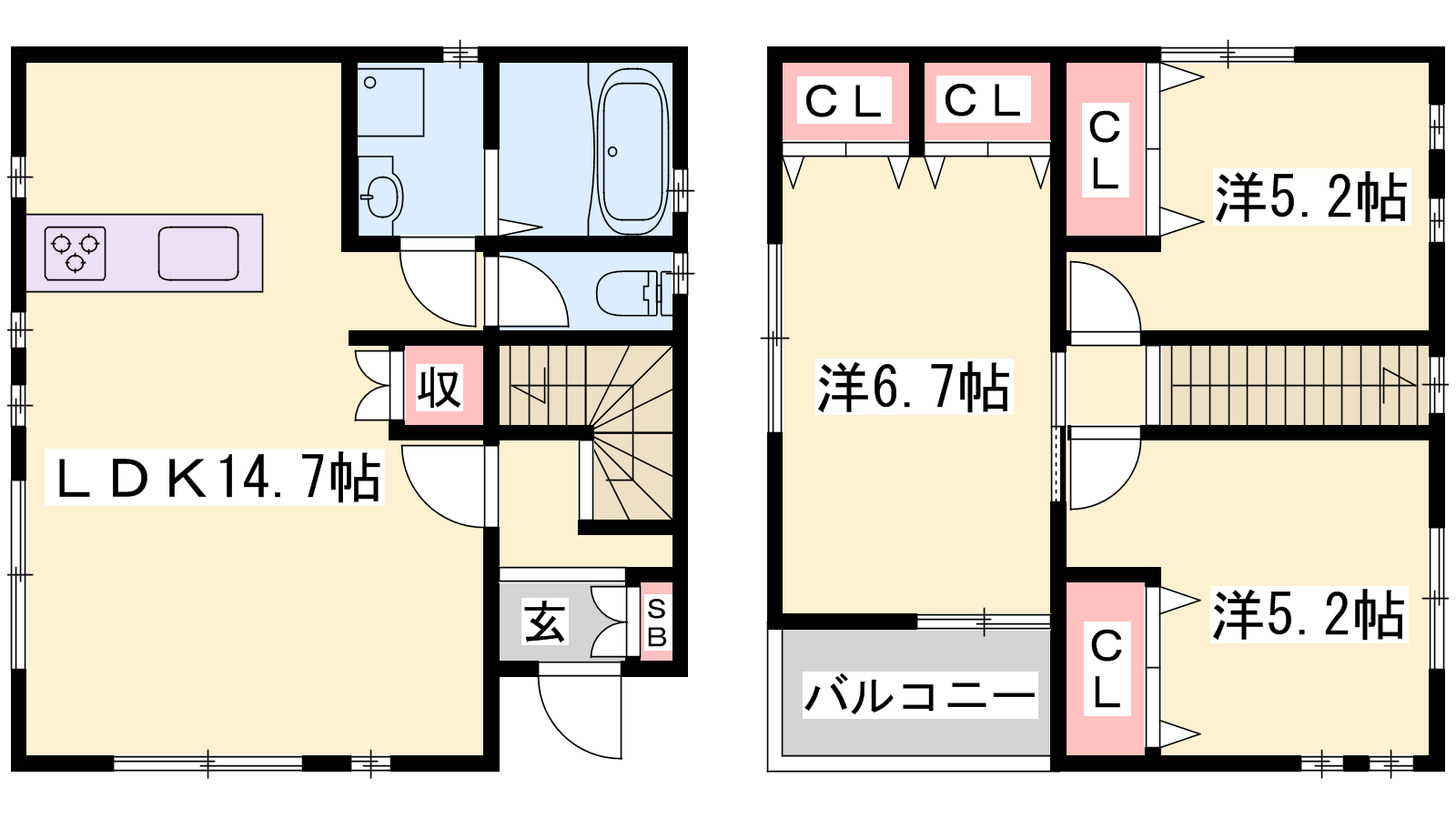 - LDK14.7帖、洋室6.7帖、洋室5.2帖、洋室5.2帖
