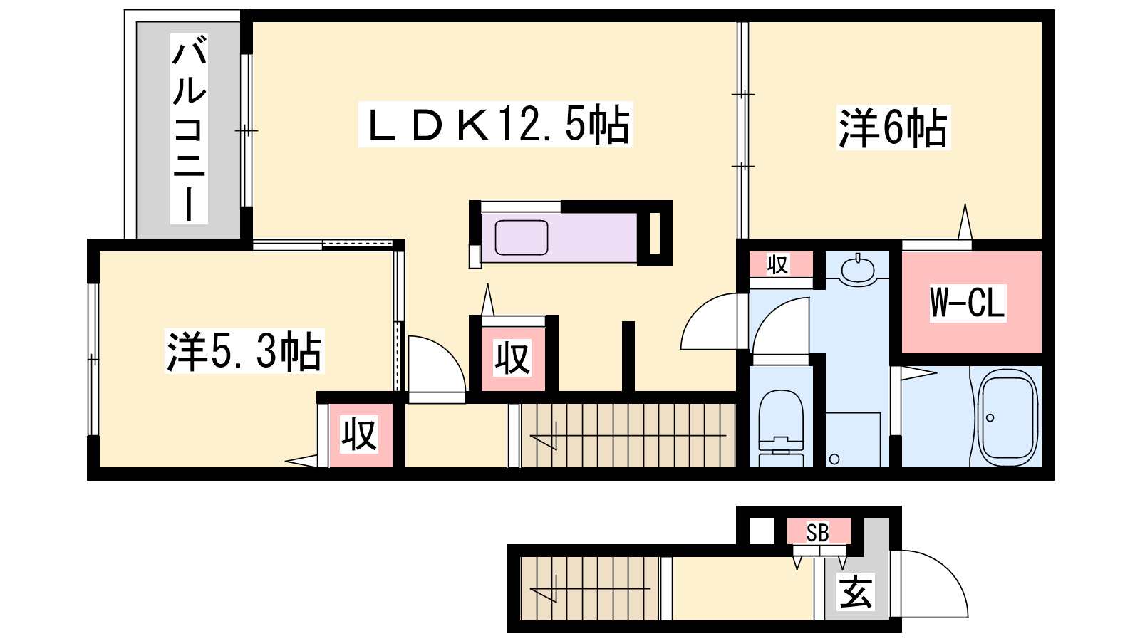 - LDK12.5帖、洋室5.3帖、洋室6帖