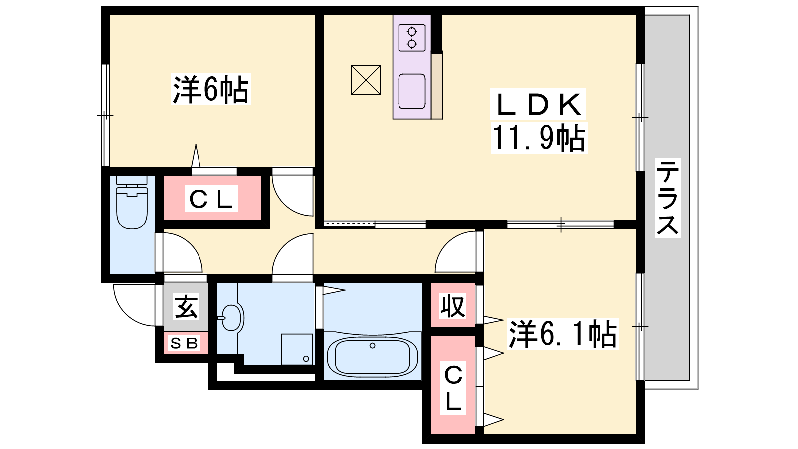 - LDK11.9帖、洋室6.1帖、洋室6帖